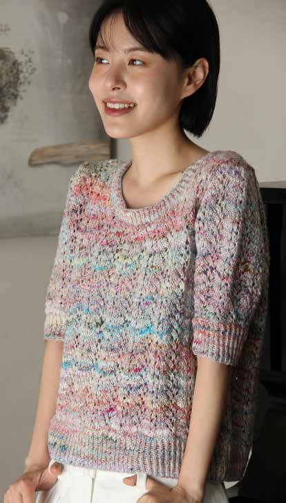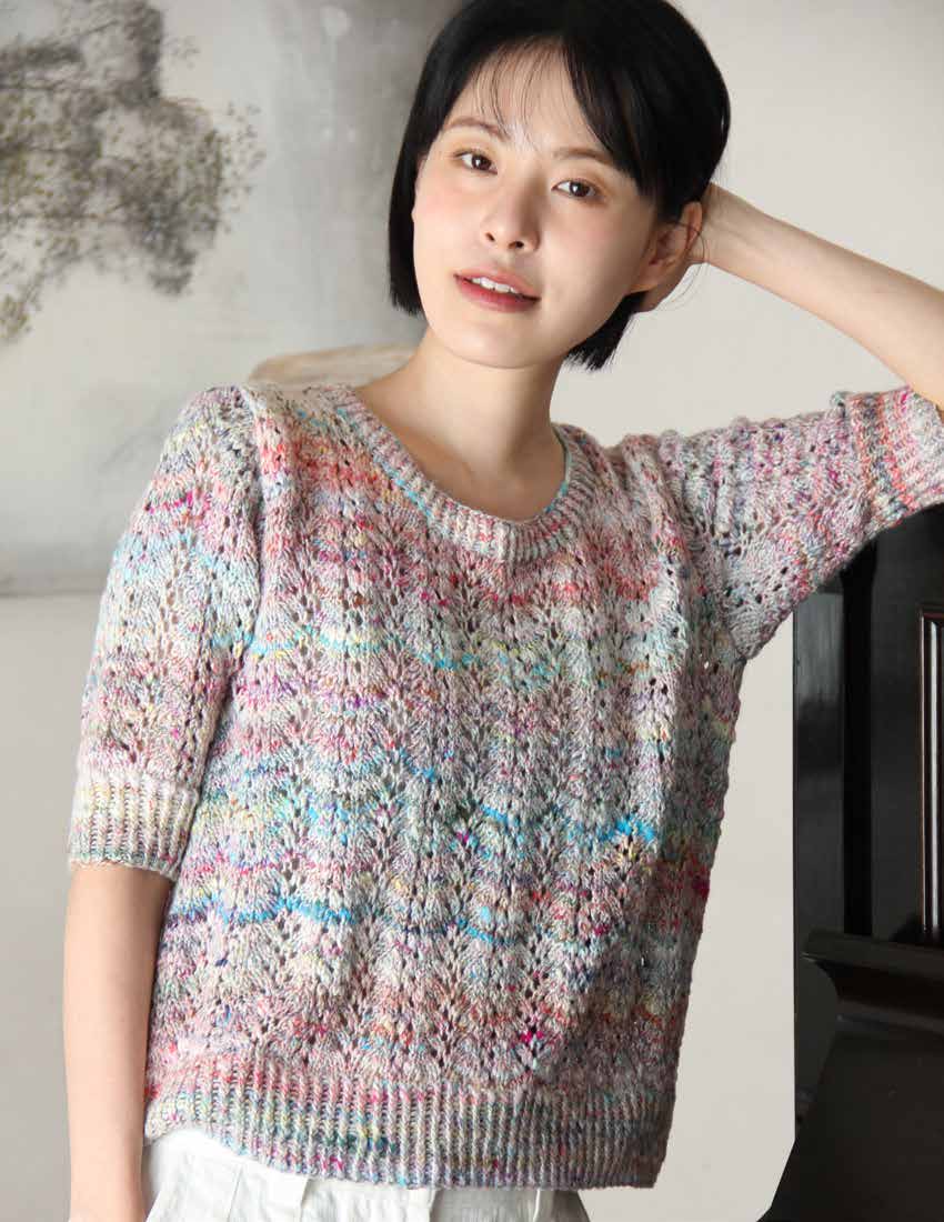 Aiko lacy short sleeve pullover, made with Noro Kompeito, digital knitting pattern download